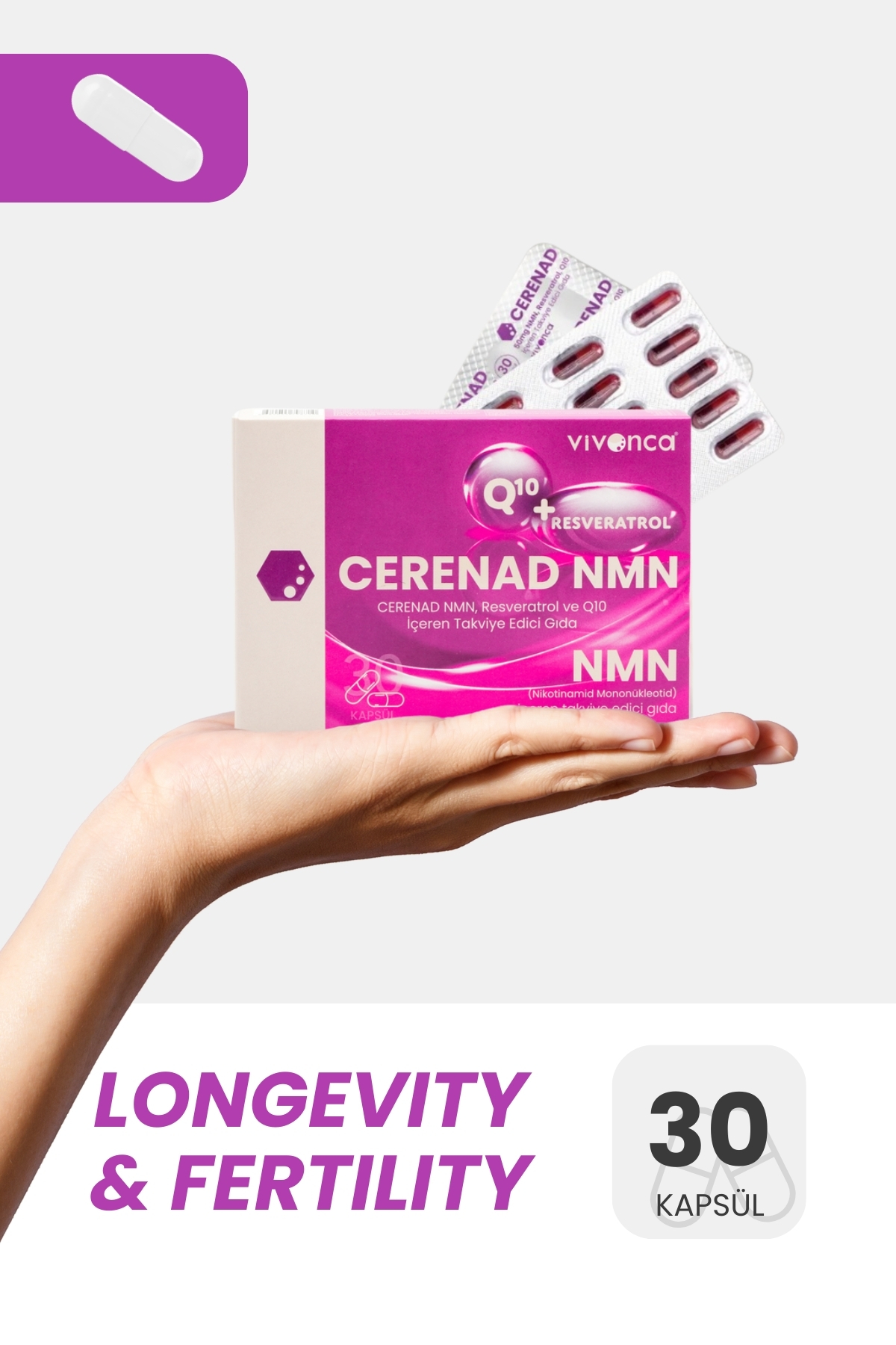 Thanks to the combination of NMN, RESVERASTOL, CoQ10, ZINC, Vitamin C, it activates the energy mechanism in cells. The more energy cells produce, the healthier and longer they live. With its high antioxidant content, it can be used to support healthy aging processes and to support reproductive health.